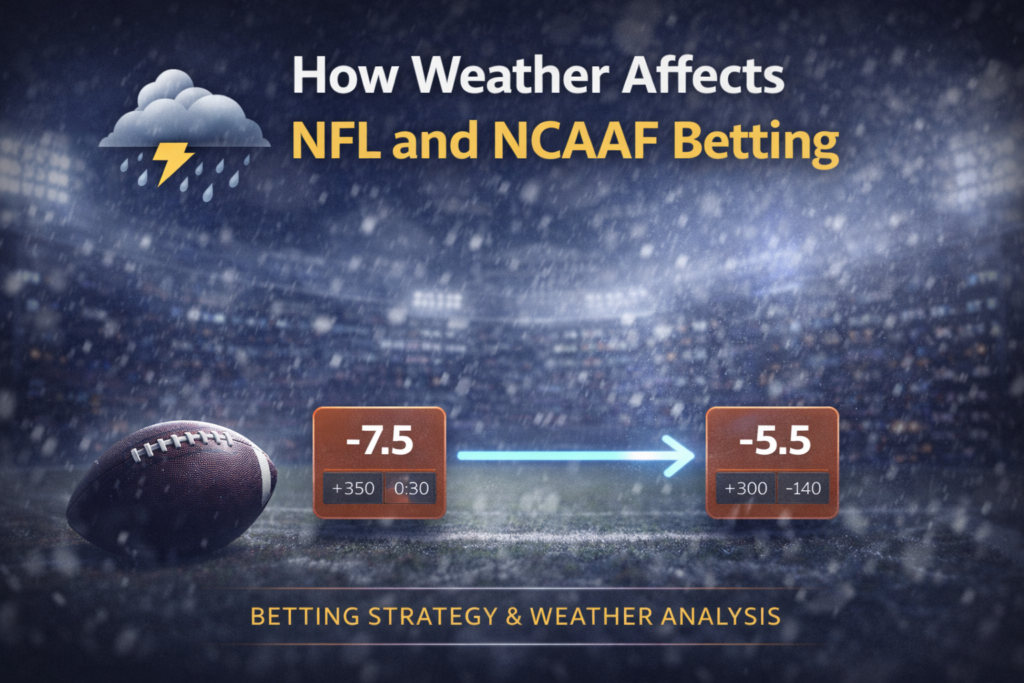 Weather affects NFL and NCAAF betting because it changes efficiency, pace, and scoring potential. Wind reduces passing effectiveness. Rain affects ball security. Extreme cold influences kicking and stamina.