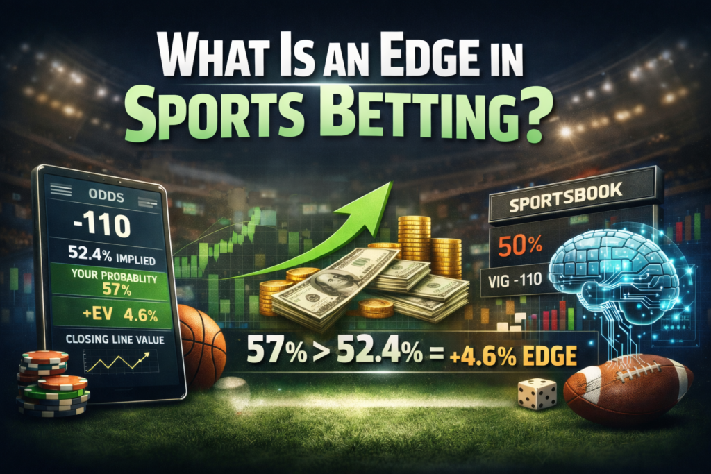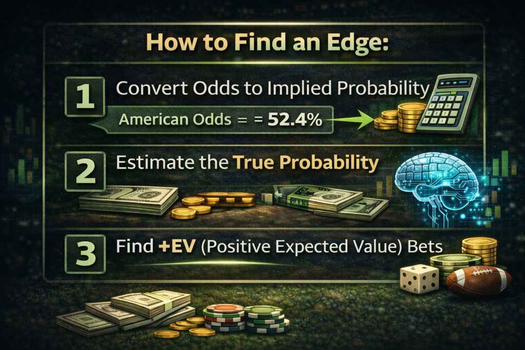 An edge exists when your calculated probability of an outcome is higher than the probability implied by the sportsbook’s odds.