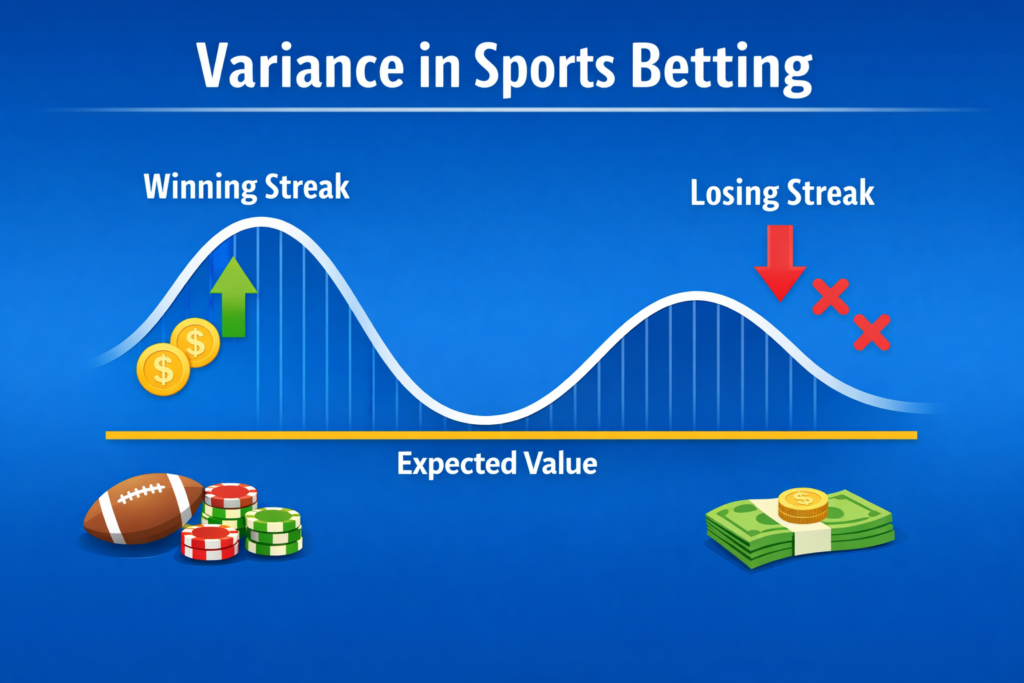 Variance measures the spread of outcomes around an expected result. In sports betting, it shows how much a bettor’s actual results can differ from the theoretical average (expected value).